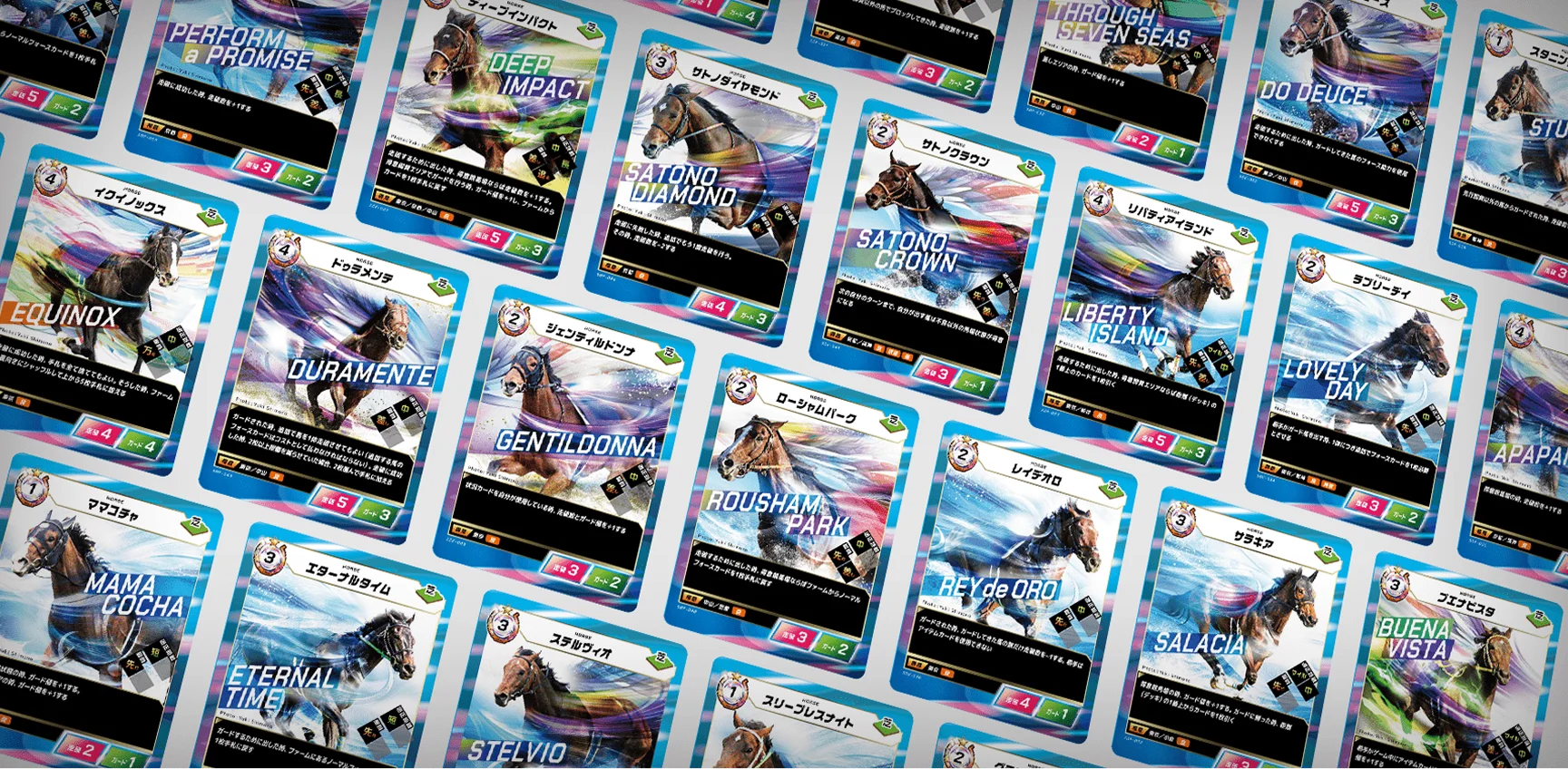 競馬の駆け引きを忠実に再現し、人馬一体となったドラマを、カードゲームフィールドに新たに展開したエンターテインメントです。