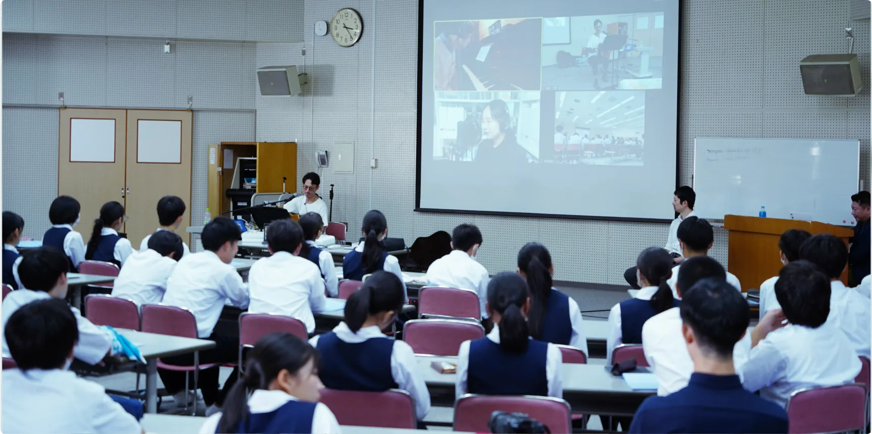 ICTの魅力を高校生に伝えるにあたって、技術やそれにまつわるサービスについての座学を伝えるだけではなく、インターネットを活用した、離れた場所にいる人をつないだライブ演奏の実演をしました。