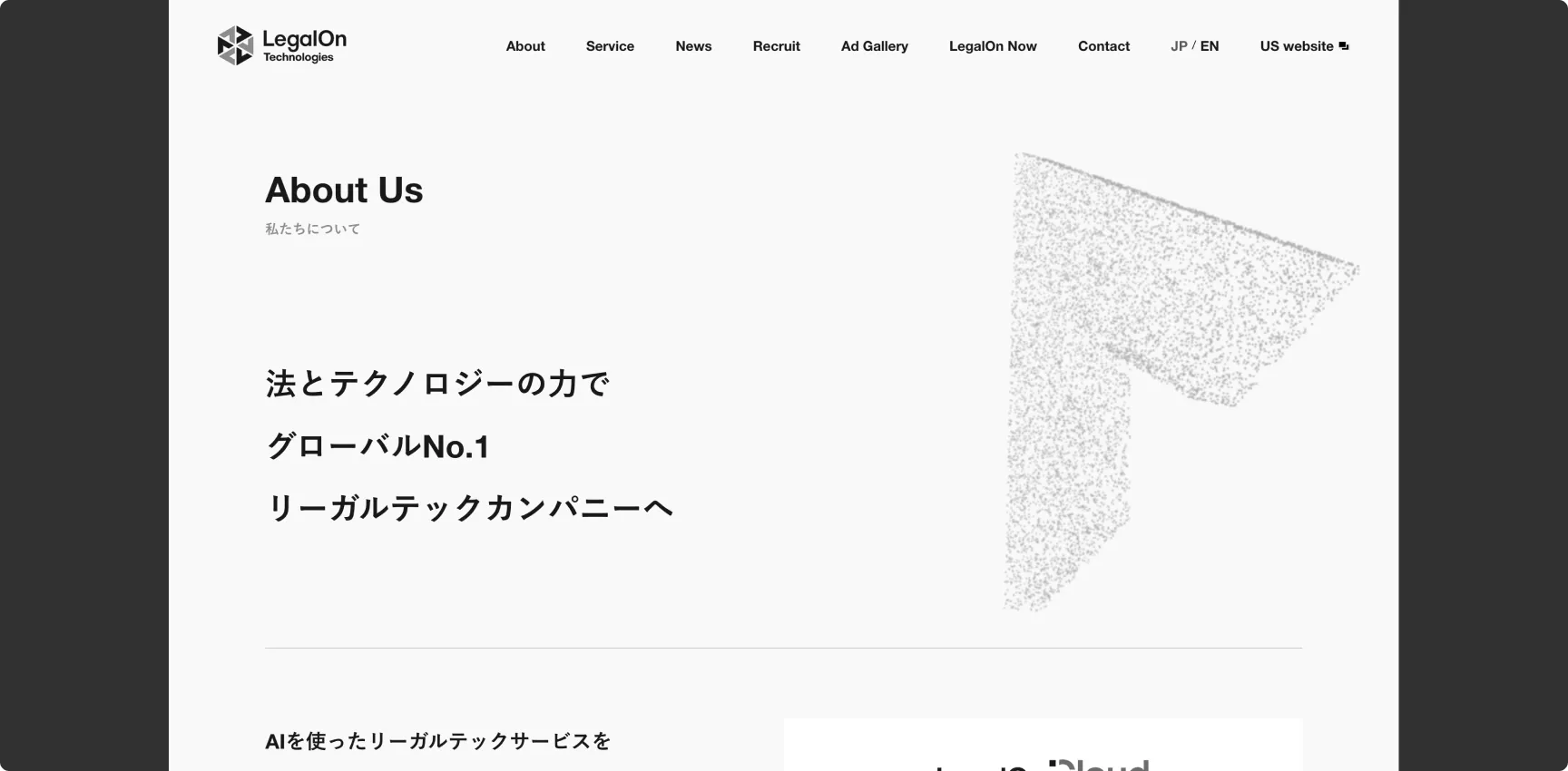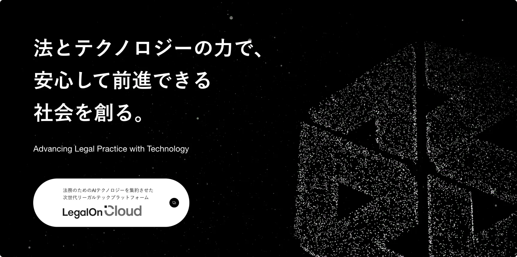 コーポレートロゴをwebGLで表示させ、「法とテクノロジーの力」というコンセプトメッセージを表現いたしました。